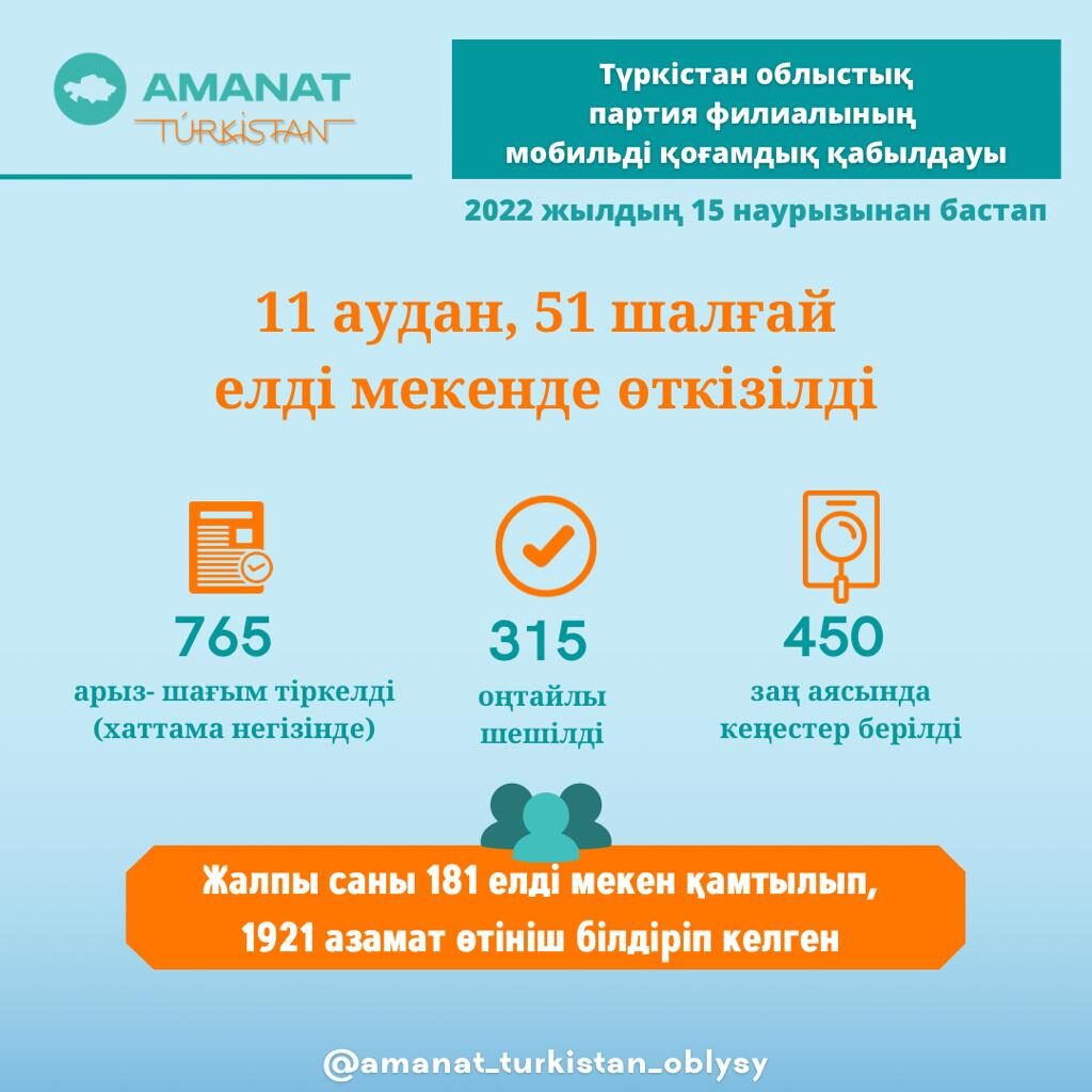 Биыл 15 наурыздан бастап партияның Түркістан облыстық филиалының мобильді қоғамдық қабылдауы өз жұмысын бастады. Бүгінге дейін мобильді топ аймақтың 11 аудан және қаласын аралап, 51 шалғай елді мекенде қоғамдық қабылдаулар өткізді. Десе де кездесулерге сол маңайдағы ауыл тұрғындары да қамтылып, жалпы 181 елді мекеннен 1900-ден астам азамат келді. Хаттама негізінде 765 арыз-шағым тіркеліп, оның 41 пайызы яғни 315-і оң шешімін тапты. Ал 450 өтінішке заң аясында түсіндірімелер берілді.
