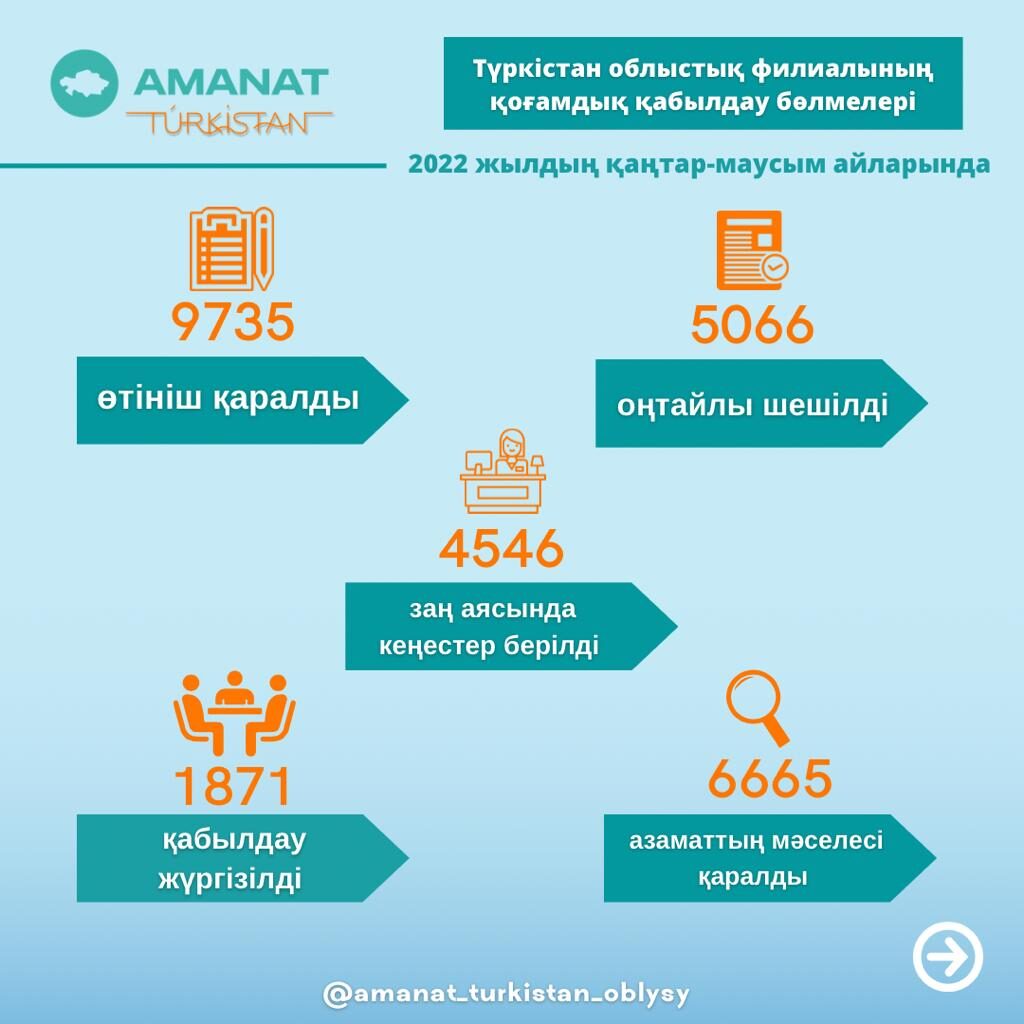 «AMANAT» партиясы Түркістан облыстық филиалында жалпы 18 қоғамдық қабылдау бөлмесі жұмыс істеп тұр. Оларға 2022 жылдың қаңтар-маусым айларында 9735 арыз-шағым келіп түскен. Оның ішінде 5066 өтініш оңтайлы шешіліп, 4546-на заң аясында кеңестер берілді. Ал 123 шағым қаралу үстінде. Ең көп арыз-өтініш Жетісай, Сарыағаш, Түлкібас аудандары мен Түркістан қаласының тұрғындары тарапынан тіркелген.